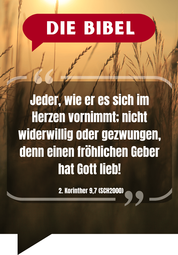 „Jeder, wie er es sich im Herzen vornimmt; nicht widerwillig oder gezwungen, denn einen fröhlichen Geber hat Gott lieb!“