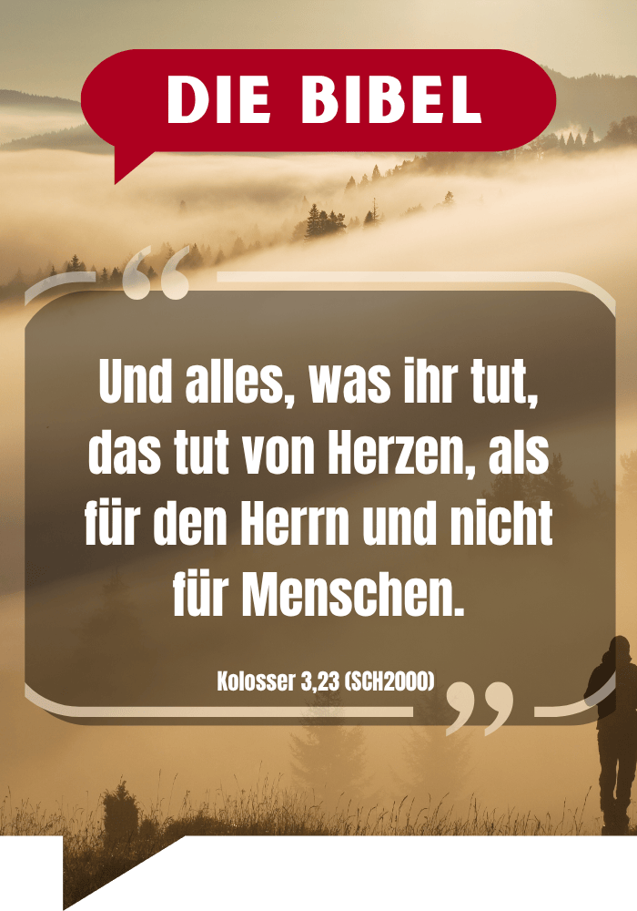 Und alles, was ihr tut, das tut von Herzen, als für den Herrn und nicht für Menschen.
