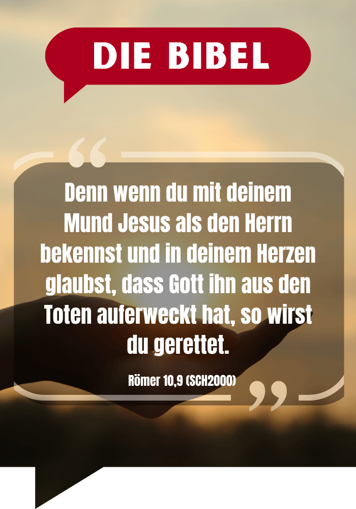 „Denn wenn du mit deinem Mund Jesus als den Herrn bekennst und in deinem Herzen glaubst, dass Gott ihn aus den Toten auferweckt hat, so wirst du gerettet.“